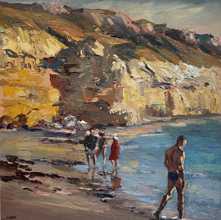 Afternoon at Port Willunga captures a serene coastal scene with meticulous detail. This oil on canvas painting showcases yellow rocks illuminated by sunlight, figures wading gently in the shallows, and the interplay of soft blue waters against the textured sand. The artist’s refined technique highlights the natural beauty and depth of the landscape, making it a distinguished piece for collectors who appreciate detailed, evocative seascapes.