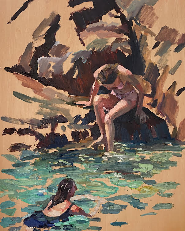 This oil on canvas painting, "Bathers, 2025," captures two women in bathers beside vibrant orange rocks—actually exposed wood—illuminated by sunlight that enhances a striking fluorescent blue water. The loose brushwork conveys movement and light, creating a dynamic and vivid scene that celebrates natural beauty and the interplay of colour and texture.