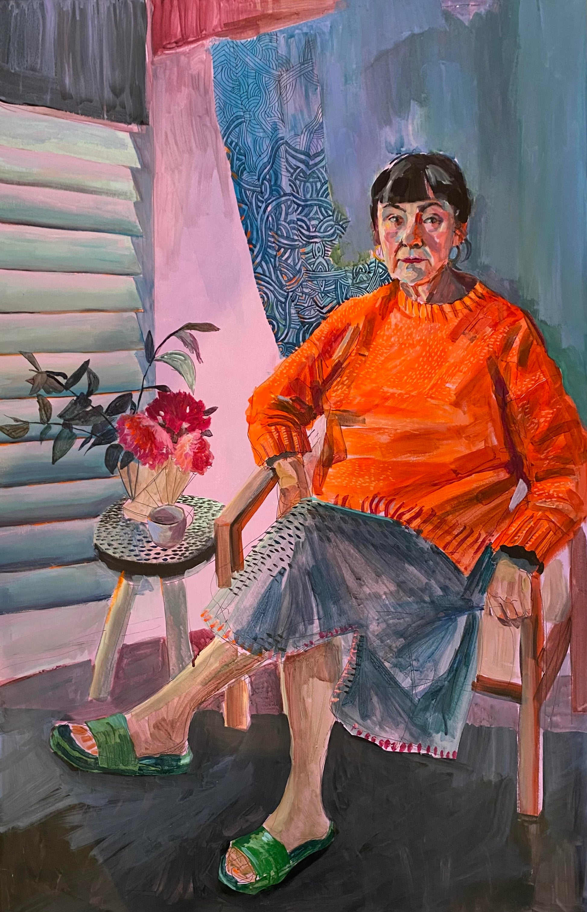 This striking portrait captures Cate Jones, a renowned ceramicist from Adelaide, seated confidently in a vibrant orange top. The composition highlights her artistic presence, with soft pink hues enhancing the background, creating a warm and inviting atmosphere. The bright colors and direct gaze convey both creativity and professionalism, reflecting Cate’s dedication to her craft.