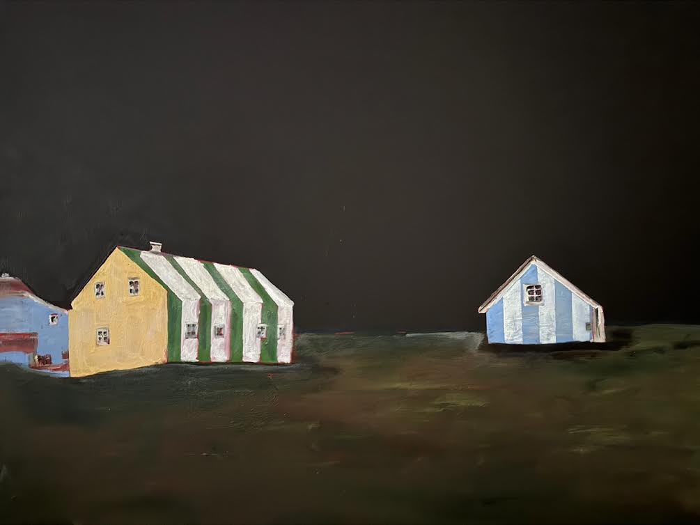 Grindavik 1, painted in 2023, is an oil on canvas artwork depicting a house adorned with blue and white, as well as green and white stripes. Set against a nighttime backdrop, the painting skillfully uses dark tones to emphasize the vibrant colors and architectural details of the house. This piece offers a refined interpretation of nocturnal urban scenery, appealing to collectors who appreciate expert craftsmanship and atmospheric depth.