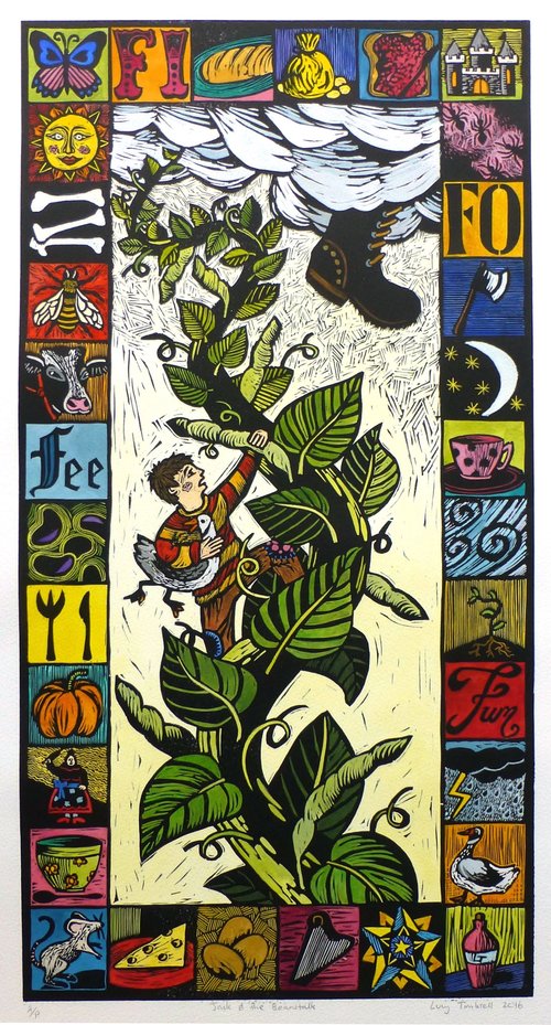 Jack and the Beanstalk illustrates the classic fairytale with a feature panel surrounded by colourful elements and characters taken form the story. Hand coloured and printed on archival paper, this artwork would make the perfect gift for children and adults alike.