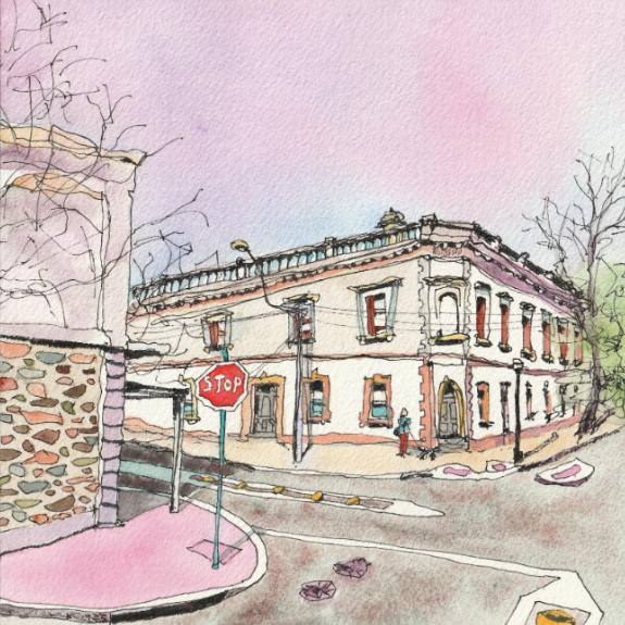 Somewhat of a storybook scene on the corner of High Street and Bridge Street. A dog walker passes the old Rising Sun hotel. The streets are calm and the colours gentle.