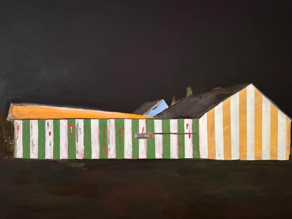 Reykjavik 9, painted in 2023, portrays a house featuring striking orange-yellow, green, and white stripes. Set against a nighttime backdrop, the artist employs a sophisticated palette of dark tones to enhance the architectural form and depth. This nuanced use of color and contrast creates a captivating visual narrative, making it a distinguished piece for collectors who appreciate contemporary interpretations of urban landscapes.
