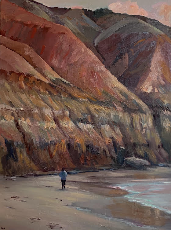 Maslins Walk is a striking oil painting on wood that vividly portrays Maslins Beach with a solitary figure walking towards the rocks. The composition is anchored by the bold, deep red hues of the distant rocks, creating a powerful contrast against the softer tones of the beach. This piece expertly balances colour intensity and subtle detail, offering a contemplative view of nature’s rugged beauty and human presence. Ideal for collectors who appreciate evocative landscapes rendered with technical precision.