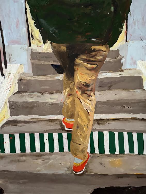 Capture the vibrant essence of urban life with this striking image of a man ascending steps in Notting Hill. Featuring bold orange shoes and a distinctive green and white signature painted across the step, this piece titled "Notting Hill 53" reflects contemporary street culture and dynamic movement. Perfect for those who appreciate modern cityscapes and subtle artistic details that tell a story of place and time.