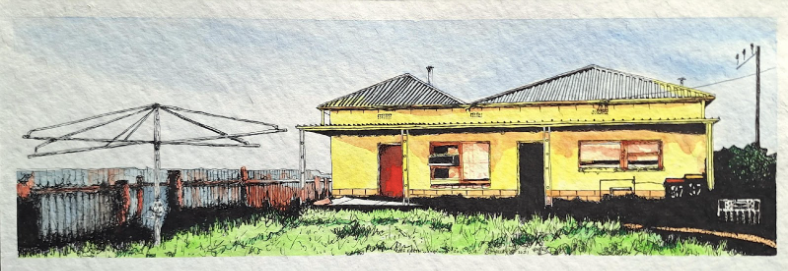 Behind a low corrugated iron fence, the rear yard of this property for sale in Norwood, Adelaide, features an iconic Hills Hoist, lush unmown grass and the brightly painted yellow veranda with red back door (indicative of it probably being rented as a “share house”).